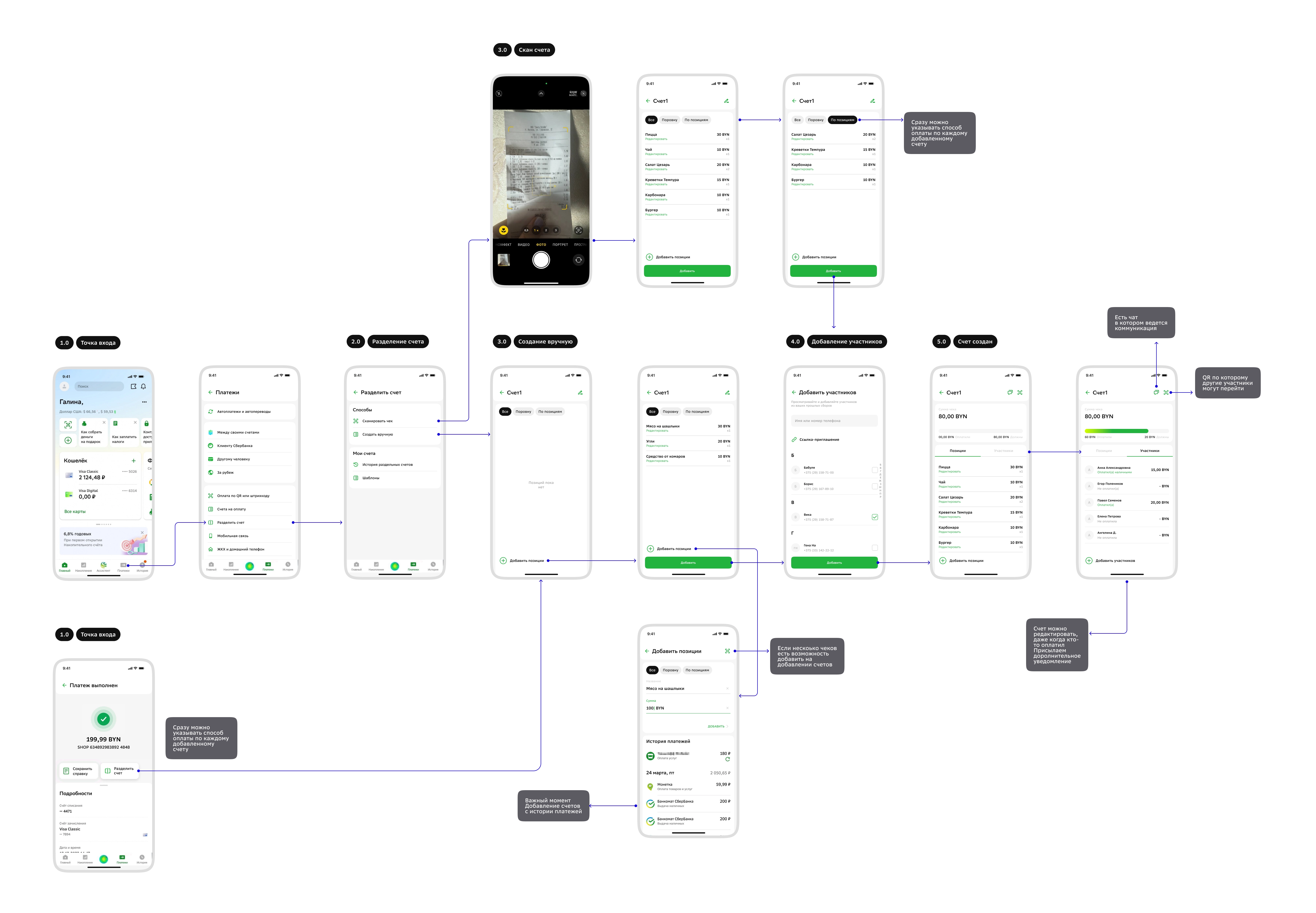 После проработки сценариев и построения флоу я перешла к созданию UI-макетов. Я проработала ключевые экраны для всех точек входа: от сканирования чека и ручного ввода до экрана с делением суммы и добавлением участников. Финальный UI получился лёгким, структурированным и хорошо встраивающимся в текущую экосистему Сбера.