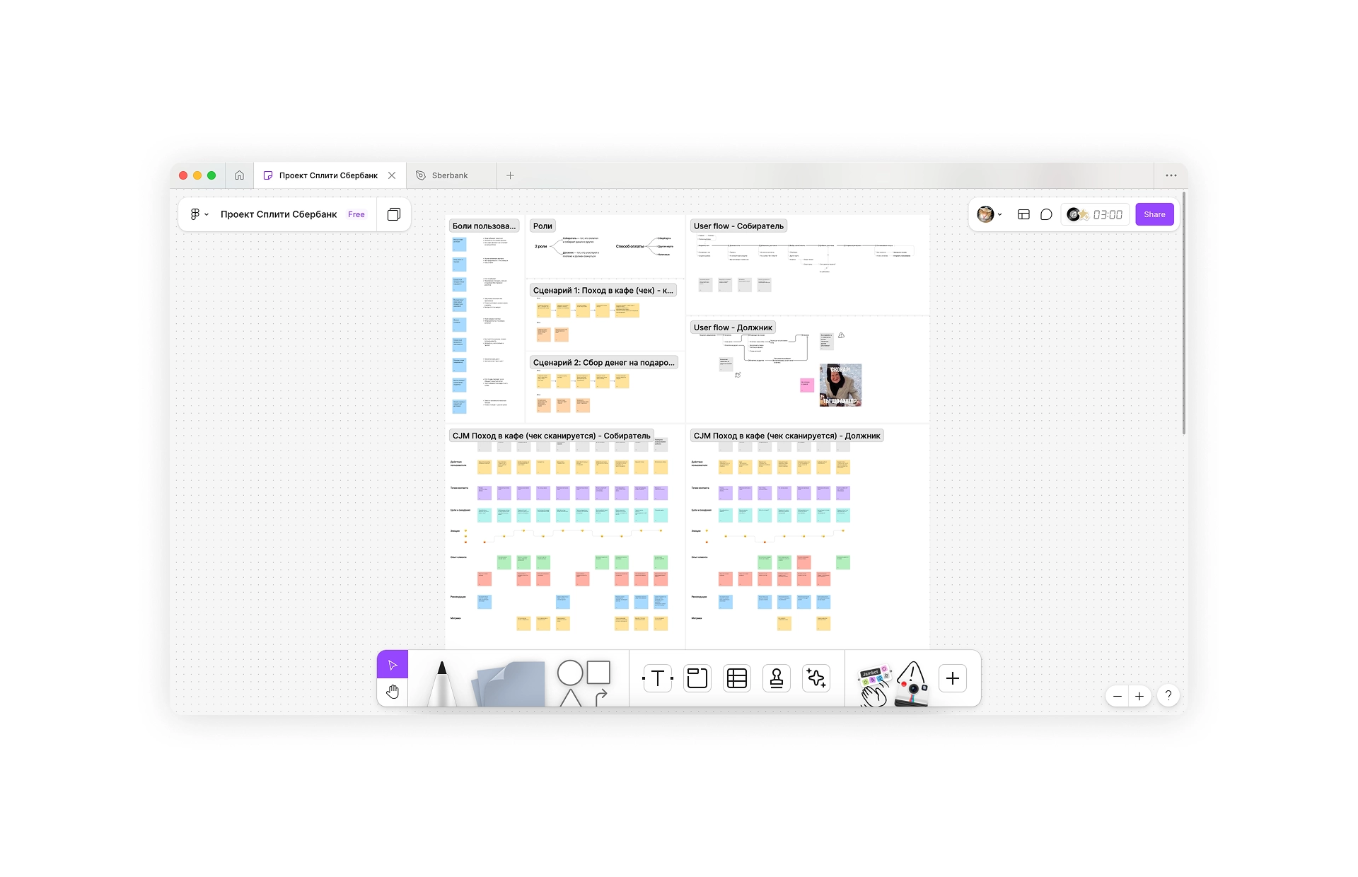 Я проработала все возможные сценарии использования: с учётом ролей (Собиратель и Должник), способов запуска (скан чека, ручной ввод, готовый платёж) и вариантов деления (поровну или по позициям). Это позволило выстроить полную пользовательскую карту, охватывающую реальные привычки пользователей. На основе анализа я построила CJM для каждой роли с фиксацией действий, барьеров и эмоций — чтобы заложить основу для удобного и гибкого UX.